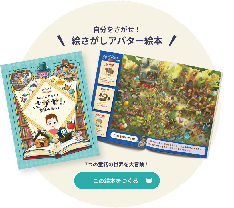 「ぼくを探せ!わたしを探せ!童話の国へん」は、いわゆるパーソナライズ絵本といって、子どもの名前とアバターから作るオーダーメイド絵本です。
